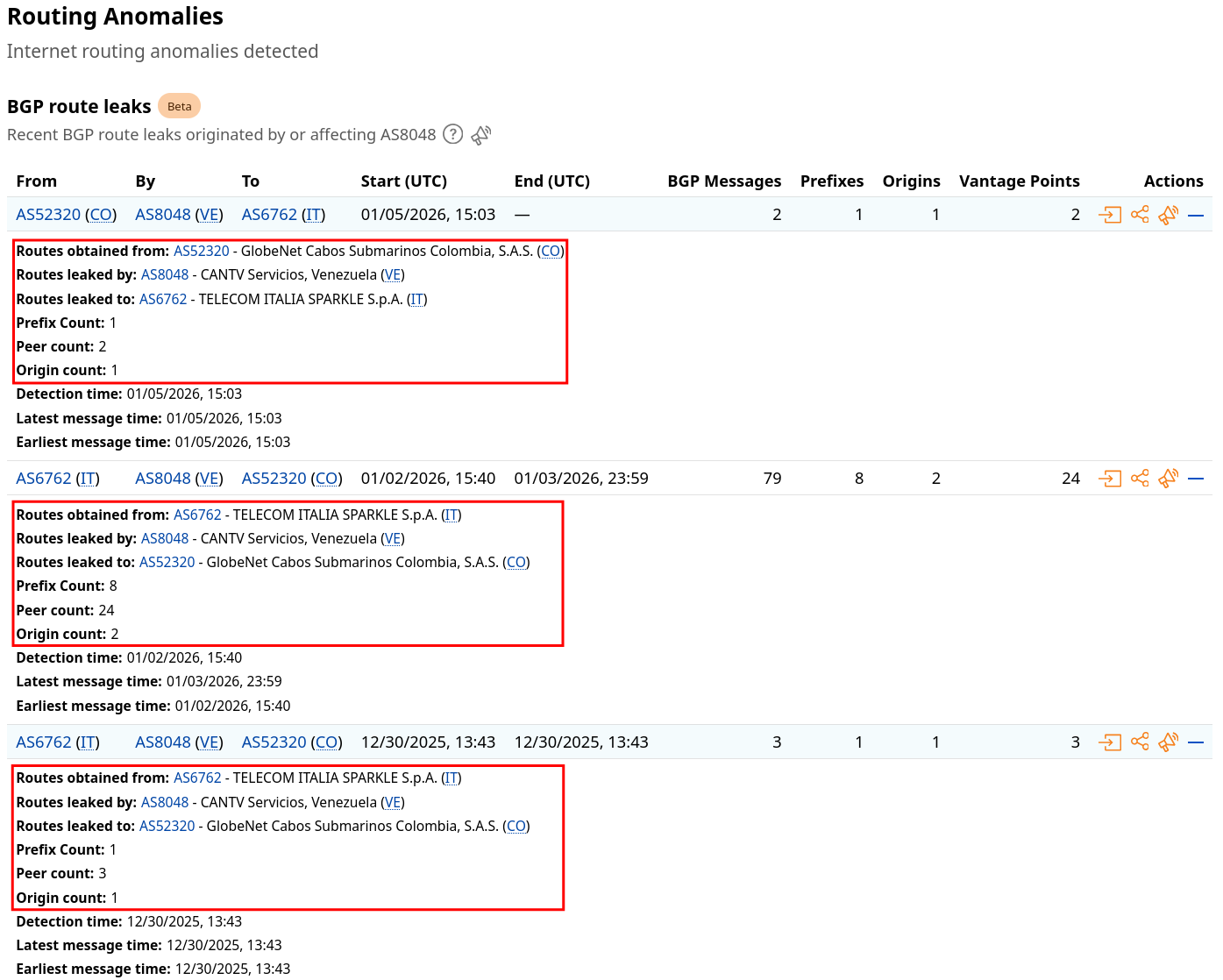 Cloudflare Radar's route leak data for AS8048 on January 2nd had some interesting anomalies: 8 prefixes (blocks of IP addresses) were being routed through CANTV, with Sparkle (an Italian transit provider) and GlobeNet (a Colombian carrier) in the Autonomous System (AS) path. The AS path is essentially the list of networks traffic passes through to reach its destination. CANTV was in a path it is not typically a part of.