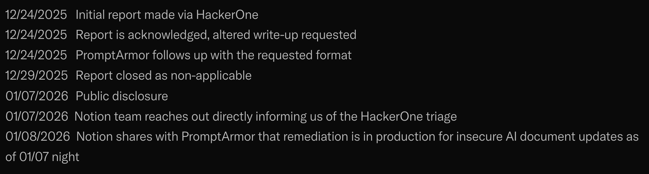 First, the disclosure timeline is REALLY small, especially for being submitted over the holidays. However what was most interesting was this report was submitted to HackerOne and closed as non-applicable. About one week later, PromptArmor disclosed the vulnerability publicly and, on the same day, Notion reached out and implemented a remediation to the vulnerability.